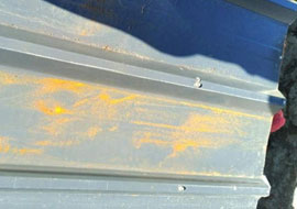 彩鋼板如今應(yīng)用十分廣泛,但是在安裝過程中,由于安裝隊伍及人員的專業(yè)水平良莠不齊,很可能導(dǎo)致一些次生的質(zhì)量問題,今天說一個案例,由于工人在安裝彩鋼板時,沒有及時處理掉打孔和切割時留下的鐵屑沫子,導(dǎo)致一場雨后,彩鋼板表面大面積生銹的事件。