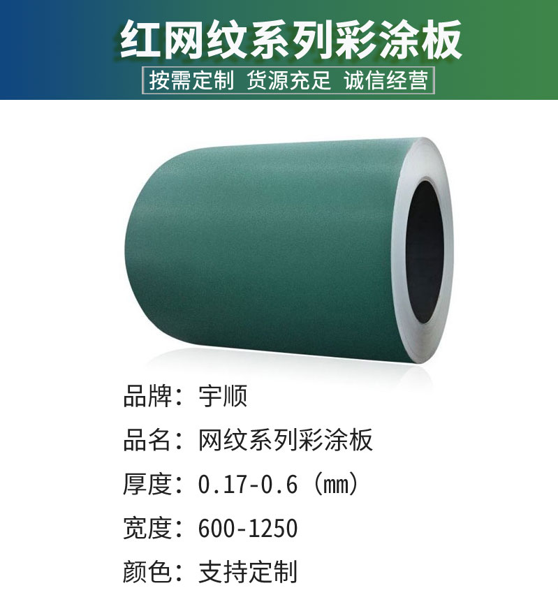 產(chǎn)品簡介網(wǎng)紋系列彩涂板有時稱為絨面彩板、皺紋彩涂板是鋼板表面涂覆有特殊性能漆涂裝,在油漆固化初期,表層油漆先固化收縮,在固化后期,表層再吸收下層的收縮,形絨面彩涂板是一種烘干后涂層表面具有絨面效果的成皺紋狀(絨毛狀、網(wǎng)紋狀),表現(xiàn)出立體效果。成品涂裝出來后板面具有皺紋狀(絨毛狀、網(wǎng)紋狀)外觀,手感柔滑,并有美觀,耐磨,防劃傷等顯著優(yōu)點,給建筑物或者家電帶來高品質的外觀效果。主要特點(1)可涂裝各種