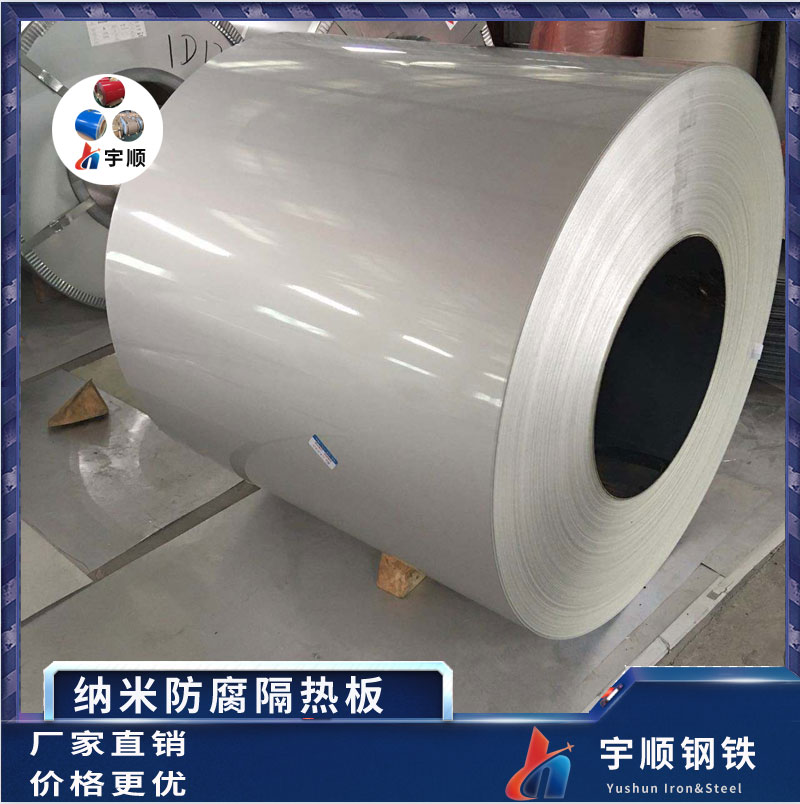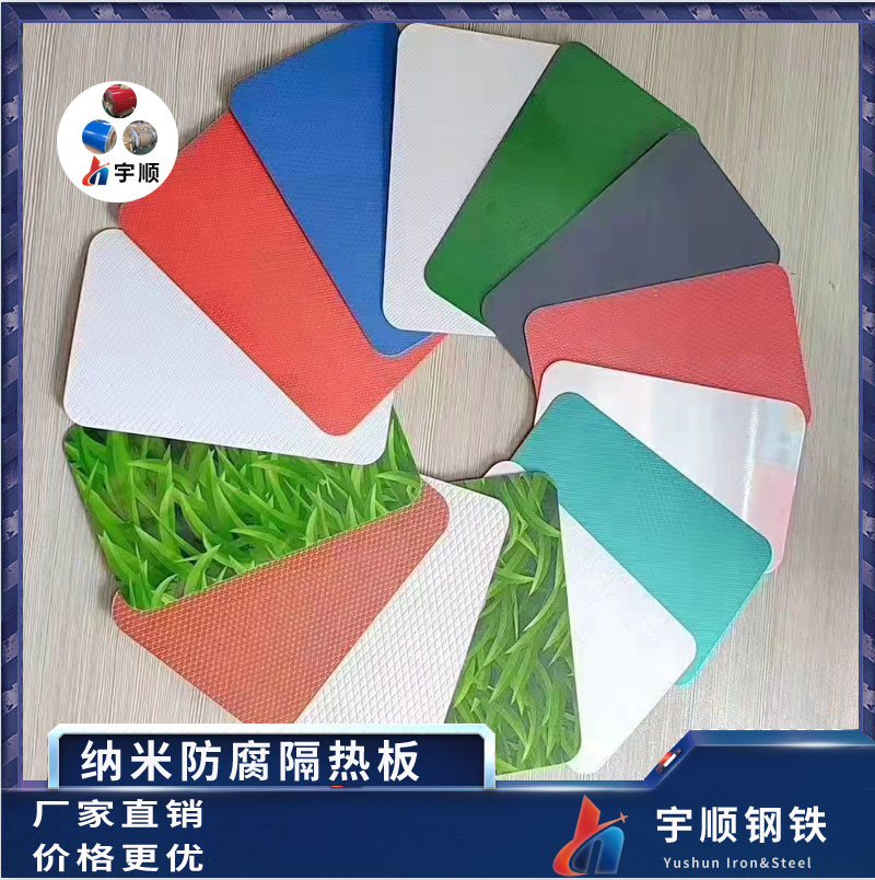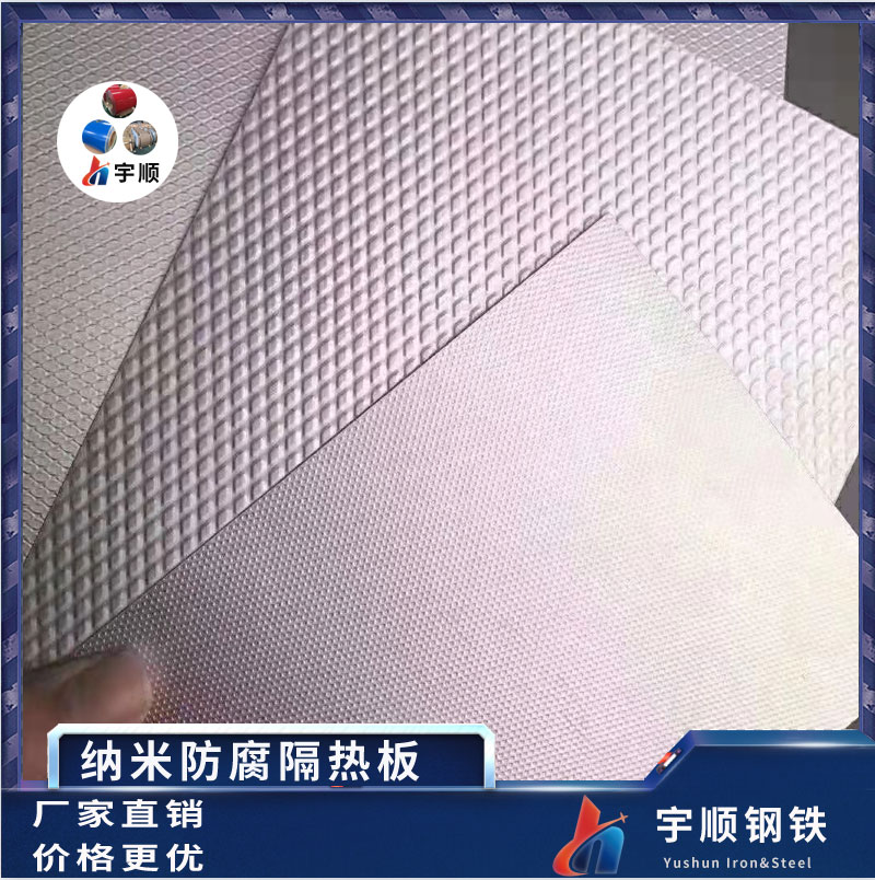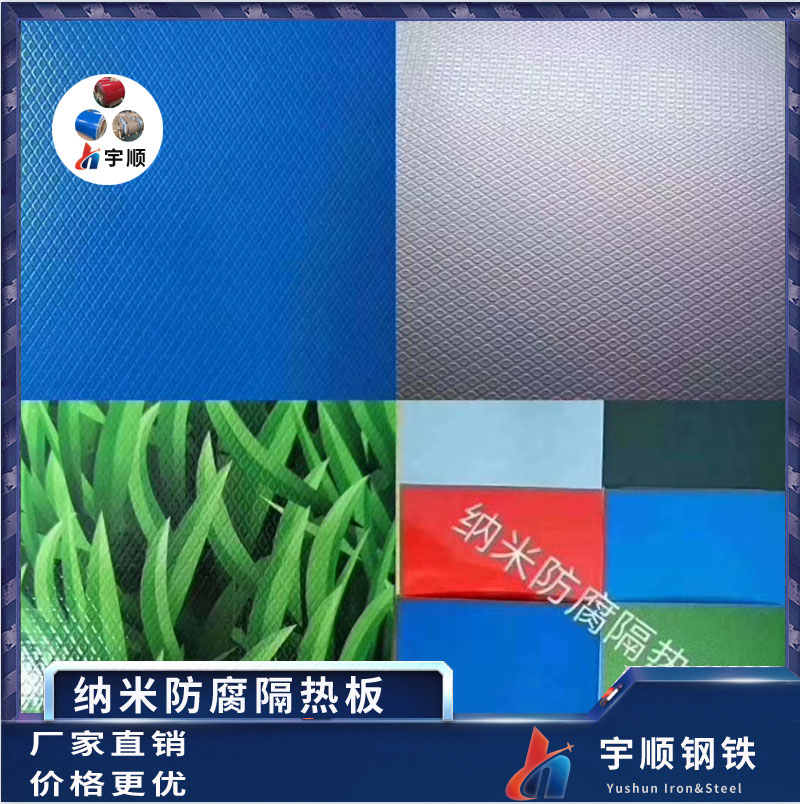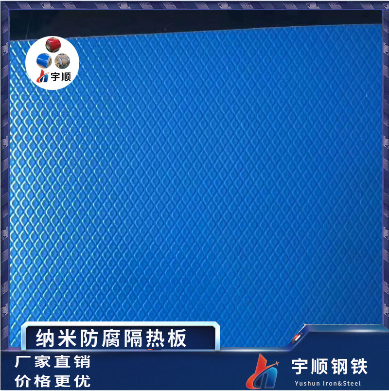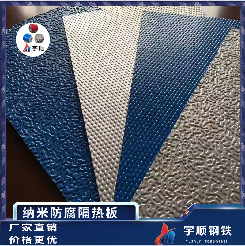 防腐隔熱鍍鋁鋅板,它以鍍鋅板或冷軋鋁板為基板,在基板的外表面依次粘履有鋁箔層、耐老化PET層,表面壓有壓多種花紋,采用耐老化膠合劑粘接,使各層粘接更為牢固,即使在極低溫的寒帶也不易剝落分層。該產(chǎn)品由于吸光率低而隔熱效果顯著,同時隔音、防火、防腐蝕、抗老化,其結構簡單,薄而重量輕,易于運輸、拆裝,使用壽命長,該產(chǎn)品不反光、無光污染,達到節(jié)能和環(huán)保統(tǒng)一。