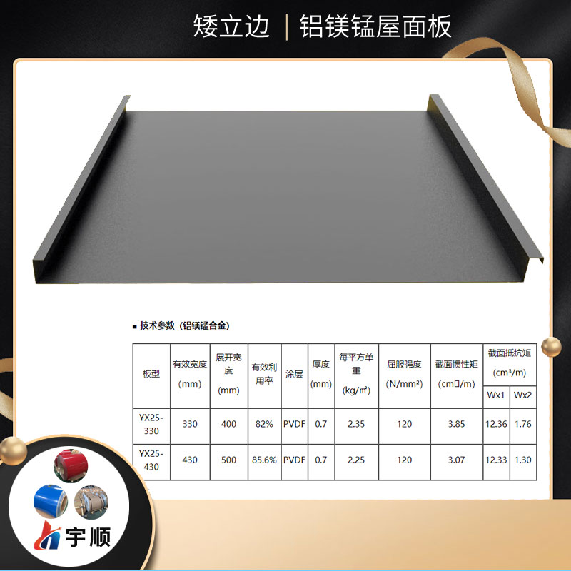 矮立邊屋面板可以用材料除鋁鎂錳板外,也有鈦鋅板、不銹鋼板、銅錢、高耐候鋼板等,廣泛運(yùn)用于商業(yè)街區(qū)、別墅群、酒店餐廳、會館等工程建筑,促使金屬材料屋面更為絢麗多彩。