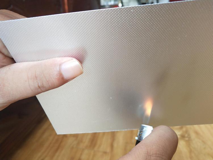 將98%濃硫酸溶液同時(shí)將滴到納米防腐板和普通彩鋼板進(jìn)行測(cè)試。右側(cè)圖片為98%濃硫酸浸泡五分鐘后的效果,普通彩鋼板涂層已完全腐蝕脫落,而納米隔熱防腐板納米抗老化PET膜依然無(wú)任何變化。
